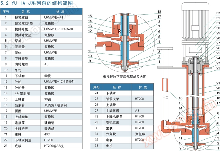 YU-1A série de bomba portátil submersa a líquido foi melhorada com base no tipo YU-1, suas partes de sobrefluxo são moldadas em todo o polietileno de peso molecular ultraalto (UHMWPE), também são moldadas por injeção em todo o polipropileno reforçado, com excelente resistência à corrosão e desgaste, adequado para o transporte de pasta ácida-alcalina ou líquido limpo na gama de -20 ° C a 80 ° C. A diferença evidente entre a bomba e a bomba YU-1 é que o acoplamento é adicionado entre o eixo do motor e o eixo da bomba, aumentando a estabilidade do funcionamento da cabeça da bomba e facilitando a manutenção do usuário.
